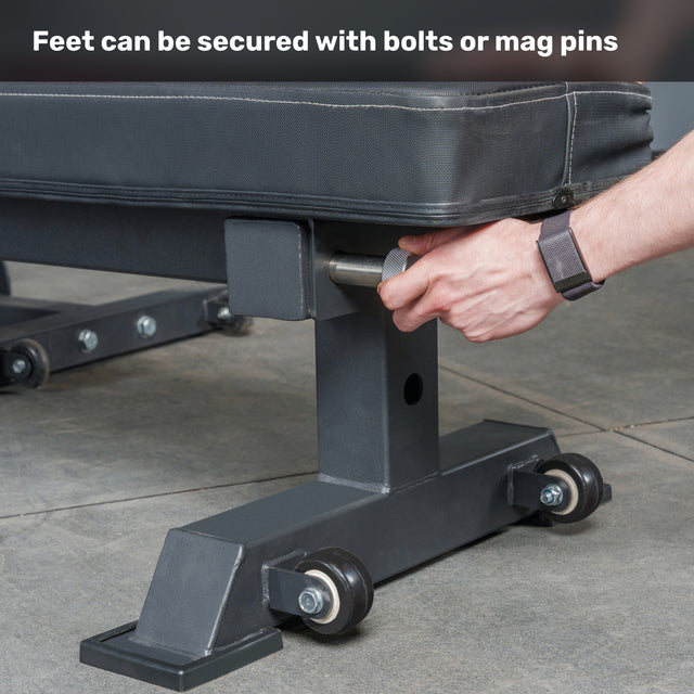 Also, this bad boy is a tank. Thick gauge steel. Competition-style padding. UHMW lining underneath so it doesn’t chew up your rack. The front foot is a single-post design that angles out for stability—while leaving room for lifters who like to tuck their feet back and actually use their leg drive. Want an incline without another bench? For more versatility, grab 2 Manticore Mag Pins (Full Length), so you can pop the pins, remove the front foot, and unlock a 27.6° setup. Simple.