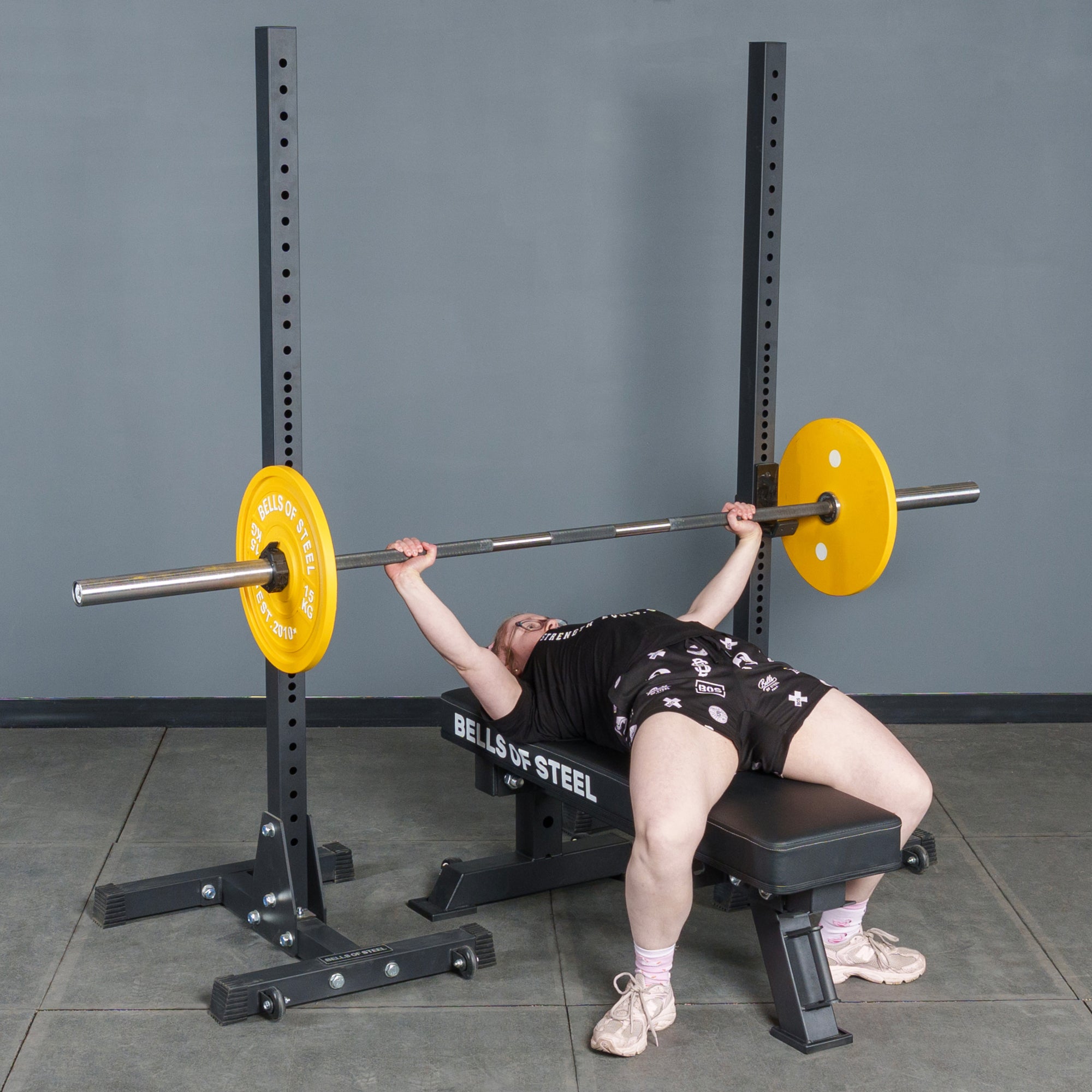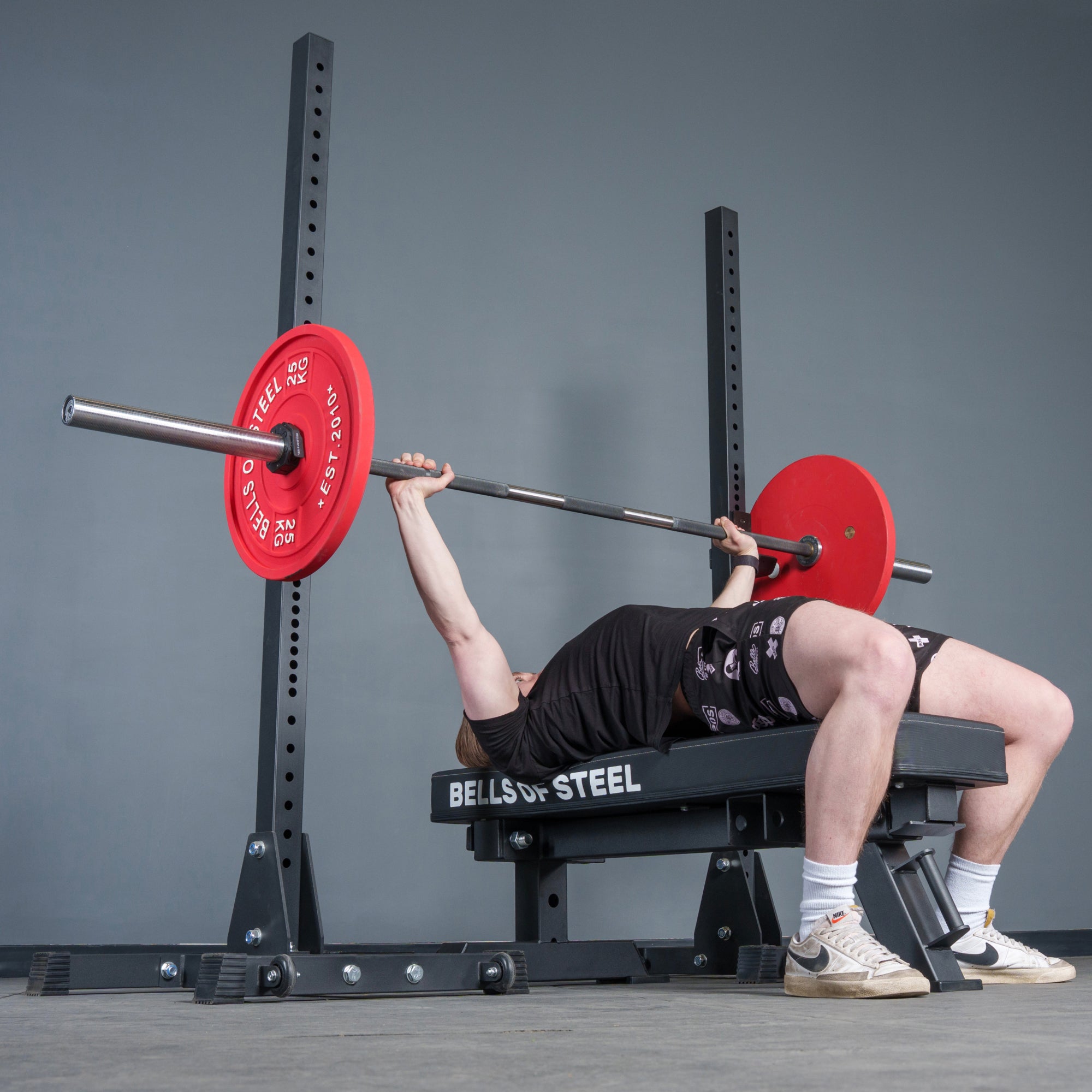 Powerlifters, this one’s for you. The single post angles outward for stability while staying completely out of the way for tucked-feet benching.