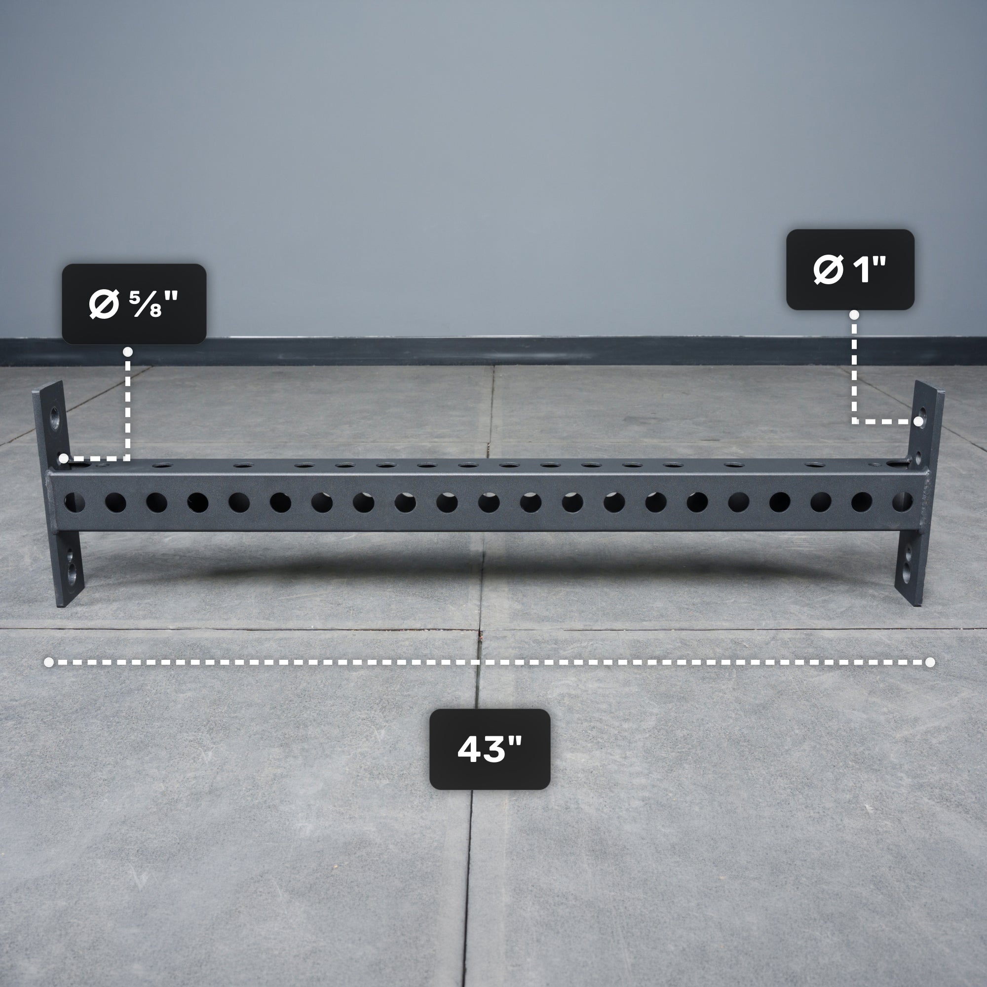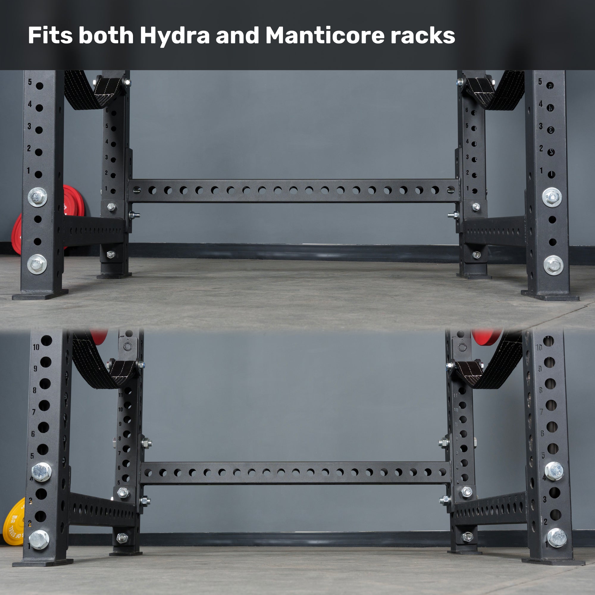 It’s a 43" crossmember with extra-large brackets and dual hole patterns — Manticore holes on the crossmember (to match the Converter Bench brackets) and oversized bracket holes that fit both Hydra and Manticore uprights.