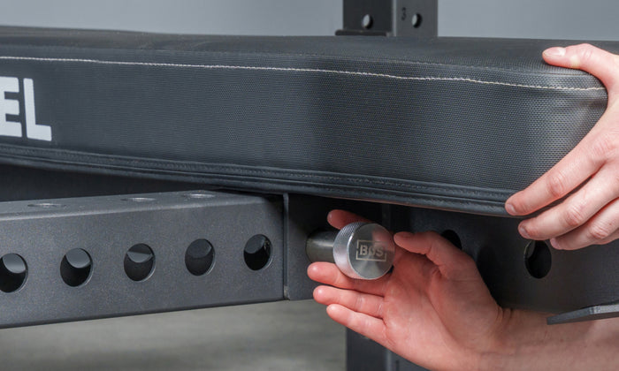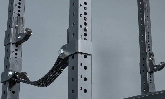 Hydra’s 1" hole spacing lets you dial in your J-cups and safeties to the exact position you need. Roller J-cups, sandwich J-cups, regular J-cups, monolift attachment — spec this station out however you want. For more versatility, grab 4 Manticore Mag Pins (Full Length), so when you’re done benching, you can pop the pins, wheel the bench out, and use the uprights for other attachments. Dips. Seal rows. Whatever.