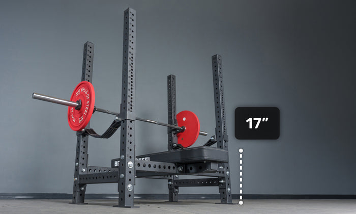 The Converter Bench hangs between the specialty crossmembers with ZERO POSTS UNDERNEATH. That means you can tuck your feet back as far as you want without hitting anything. For powerlifters who rely on leg drive, this is a big deal.