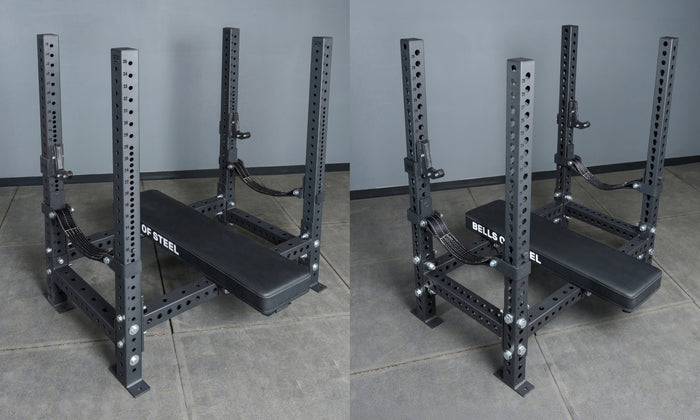 The four-post bench station is what you see at powerlifting meets and serious commercial gyms. It’s a dedicated bench press station with its own uprights, J-cups, and safeties — and the Converter Bench makes it happen.
