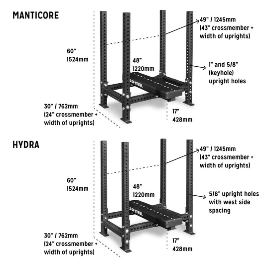 Choose from 60" Hydra uprights or 60" Manticore, both with the 3”x3” cross-brand compatibility you know and love (or hate, if you work for a competitor.) Either way, you’re getting IPF competition height and a four-post station that’s more versatile than anything else on the market.