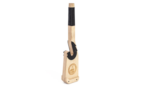 The Bells of Steel Meat Hook Deadlift Jack is a wooden, axe-shaped barbell jack with a black grip and a round logo with text and a hat. Its light wood grain adds style, making it both functional and eye-catching.