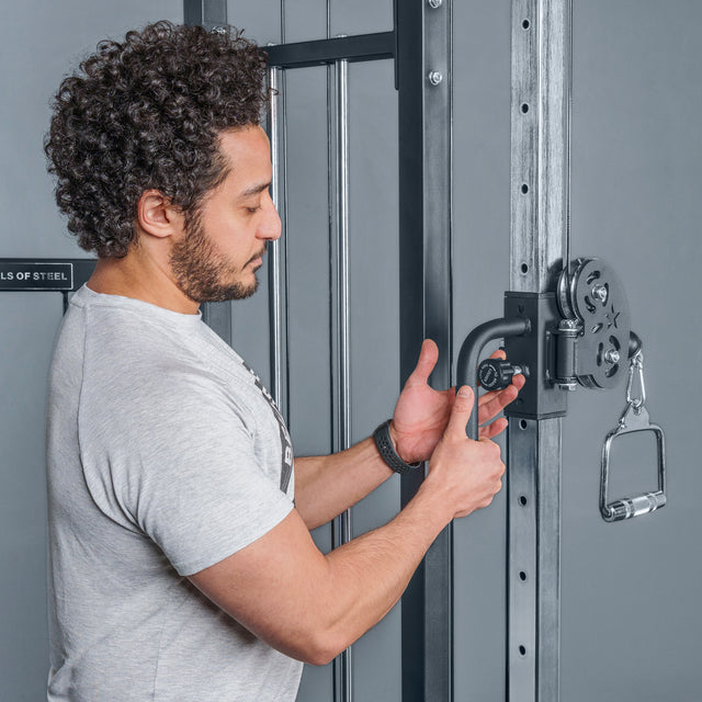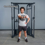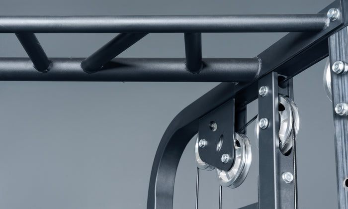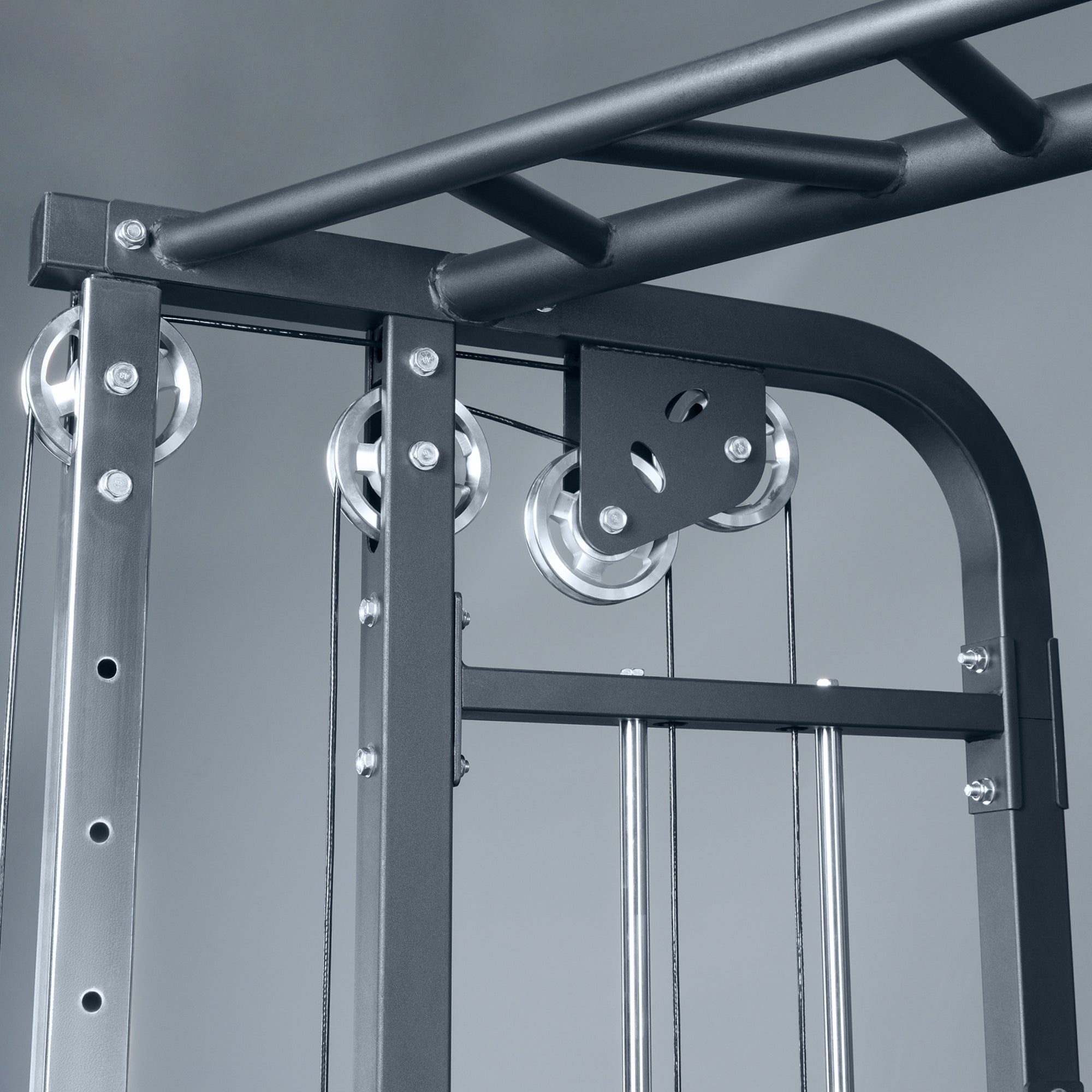 Aluminum pulleys and high-quality bearings offer a buttery smooth experience with a 2:1 pull ratio, and the multi-grip pull-up bar offers stability and even more versatility in this space-efficient, affordable setup.