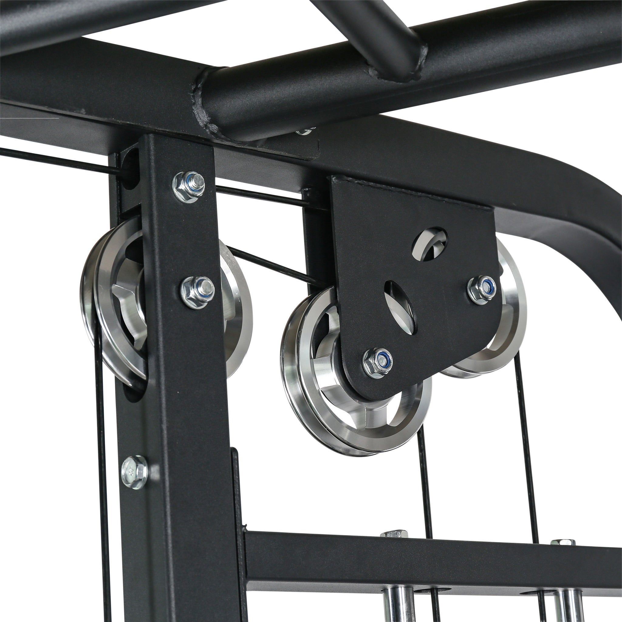 Aluminum pulleys and high-quality bearings offer a buttery smooth experience with a 2:1 pull ratio, and the multi-grip pull-up bar offers stability and even more versatility in this space-efficient, affordable setup.