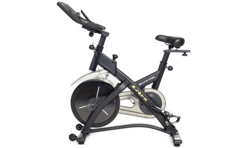 Introducing the Bells of Steel Blitz Indoor Cycling Bike, a modern stationary exercise bike featuring an adjustable seat and handlebars. Its sleek black design includes a large flywheel, magnetic resistance, and a compact digital display—perfect for dynamic indoor cycling workouts.