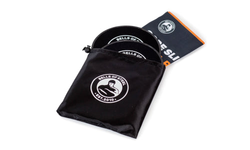 The Bells of Steel Core Sliders set includes two black round sliders, a black drawstring pouch, and a workout poster with images and instructions for a full-body workout.