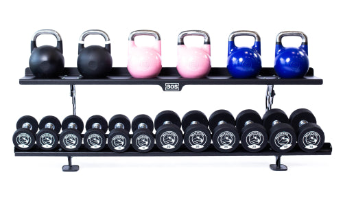 Flaunt your prized commercial urethane dumbbells & competition kettlebells in immaculate style. This swappable storage shelf is the choose-your-own-adventure of home gyms. Opt for two dumbbell shelves, two kettlebell shelves, or mix and match with one of each.With several lengths to choose from and a 1,200lb capacity, you can make the most of your space. Here's the scoop:- Two 34″ dumbbell trays fit our 85-100lb set of commercial dumbbells.
