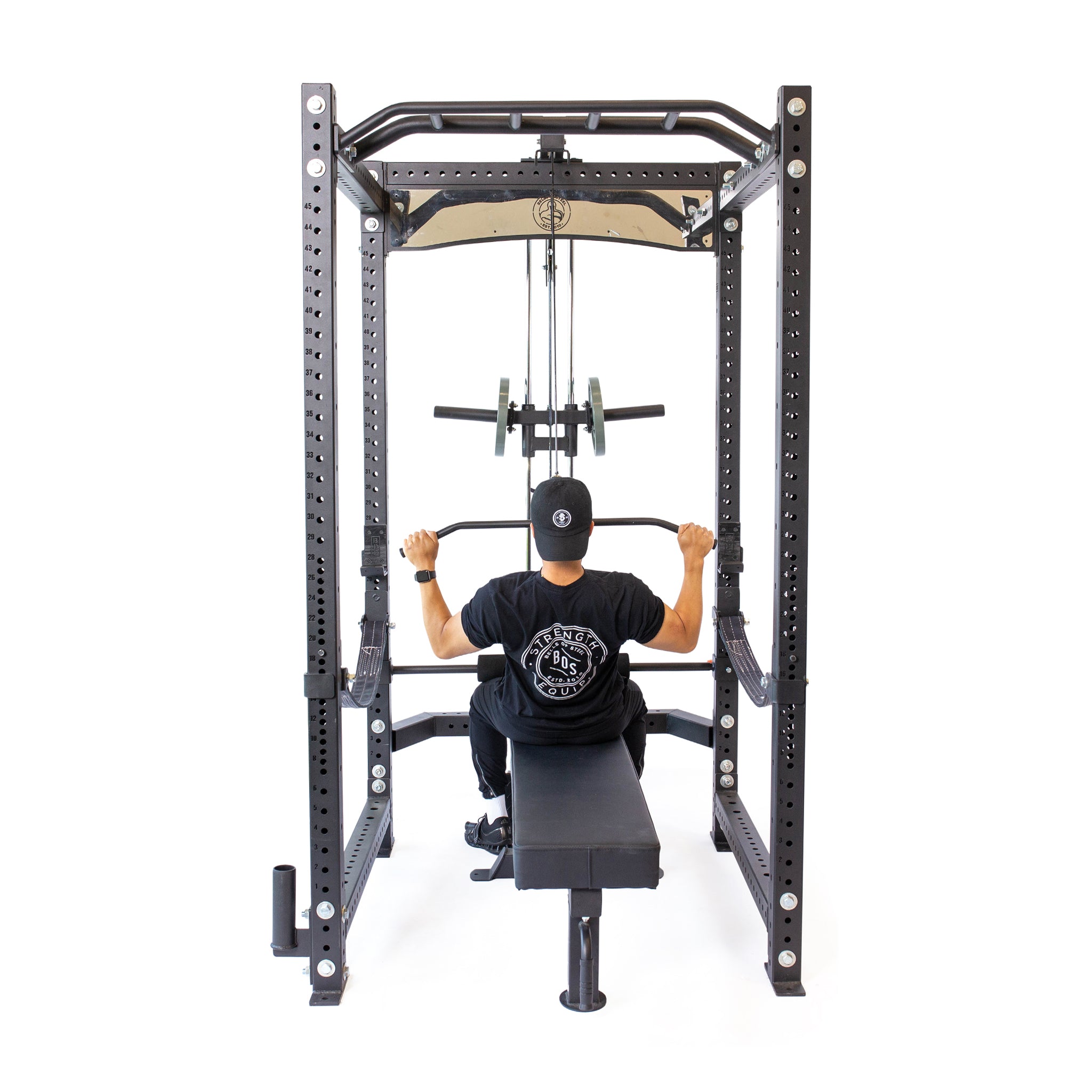 With this rack attachment, you can do lat pulldowns, cable rows, and other cable exercises using the same machine and seamlessly switch between them while adding only 30" of depth and 4.5" of height to your existing rack.