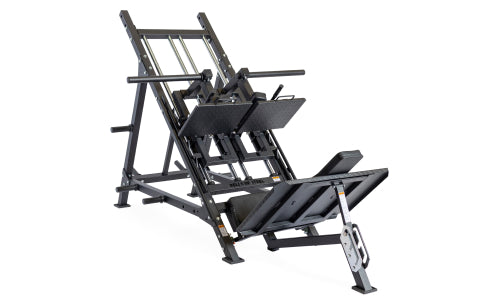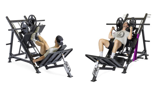 Switch between exercises in under a minute. For hack squats, flip down the footplates, move the back pad, and adjust the hack squat platform to your desired position. For leg presses, do it in reverse. Now you have plenty of time for cardio. *Motivation not included.