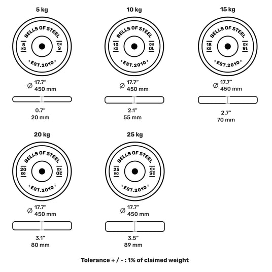 Cheap bumpers can be up to 10% off the claimed weight, causing you to put the wrong weight on the bar. Our bumper plates are accurate to +/- 1% of the claimed weight. No more second-guessing what's on the bar - ever.