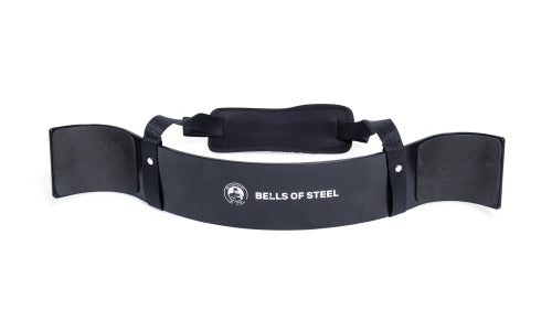 The Bells of Steel Arm Blaster is a black weightlifting accessory with padded straps and a white logo, designed for bicep curls and tricep pushdown support.