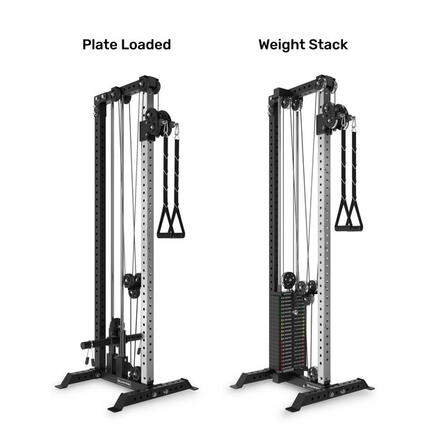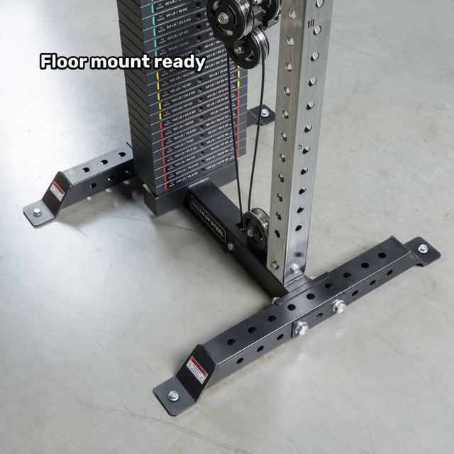 The Bells of Steel Cable Tower delivers full cable-machine functionality in a compact footprint under 2.5' × 2.5'—making it one of the most space-efficient cable systems available. With 30+ height settings, dual pull ratios (2:1 and 1:1), and your choice of plate-loaded or 210 lb selectorized stack, it's designed to give you commercial-level versatility without the size or cost of traditional cable machines.