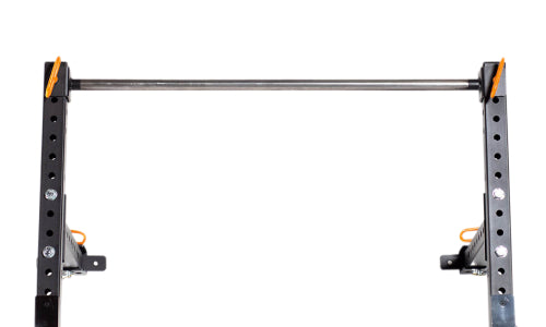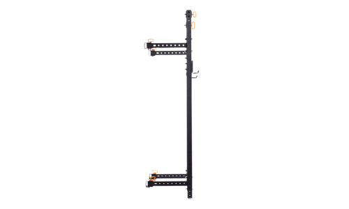 A simple hinge and pin system allows you to quickly remove the pull-up bar after a workout, then fold the sides of the squat rack inwards against the wall to open up a massive amount of space. Superior 1" spacing through the bench and pull zone, and 2" spacing above and below allow you to select the perfect height for your j-cups, for precision lift-offs that can make the difference between a good rep and a superb rep.