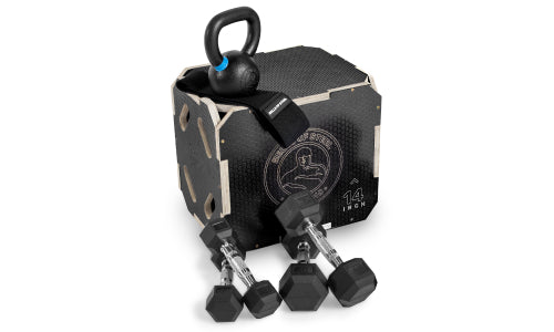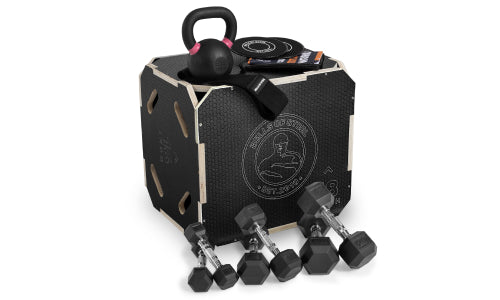 Alright goal-getter, we get it: this ain't your first rodeo. In this kit, you get the 22lb kettlebell, the medium plyo-box, the 5-50lb set of NUOBELL adjustable dumbbells, a glute loop, and core soldiers. Ye-freaking-haw!