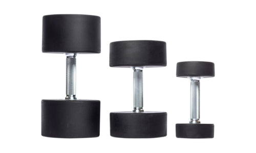 The urethane dumbbells are sold in sets of 5-50lbs, 55-80lbs, and 85-100lbs. Available as pairs in 10lb increments from 60-150lbs.