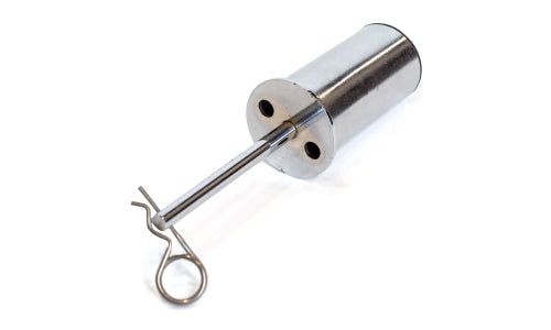 The Bells of Steel Weight Stack Pin is a metal cylindrical pin with a handle and locking clip, ideal for securing trailer hitches, heavy equipment parts, or as an attachment for cable machines in gyms.