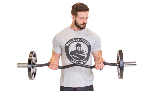 The Bells of Steel EZ Curl Bar (45") in black and silver, featuring angled grips for efficient biceps and triceps training, is displayed on a white background.
